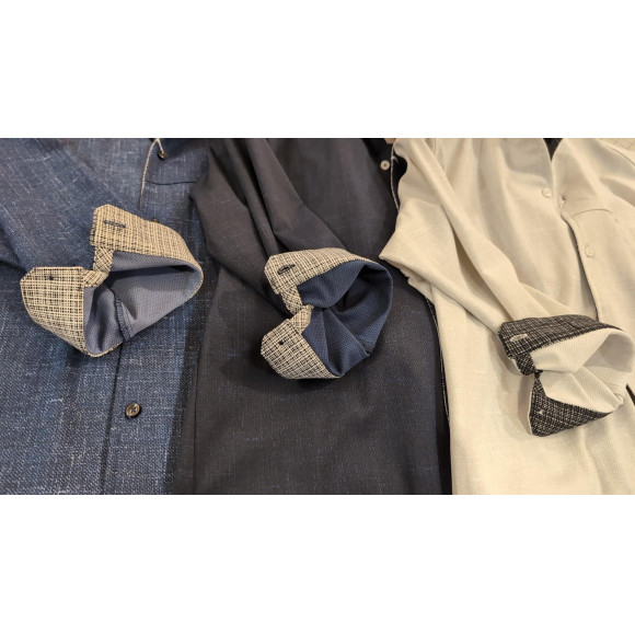 身返しや袖口裏には同素材でプリント違いの生地を使用し、着用時のアクセントにしています。