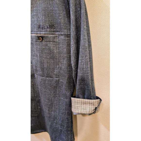 左胸のスラッシュポケット、RIELABO刺繍や別注釦、脇の縫い代に抗菌防臭テープを仕込んで機能性をプラスしています。