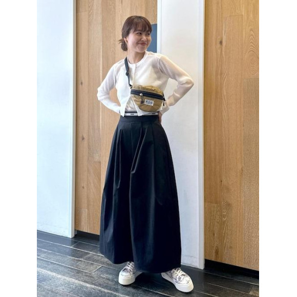 ハイウエストなボトムとも相性抜群なので、ベルト部分がポイントのスカートでちらっとロゴを見せています◎