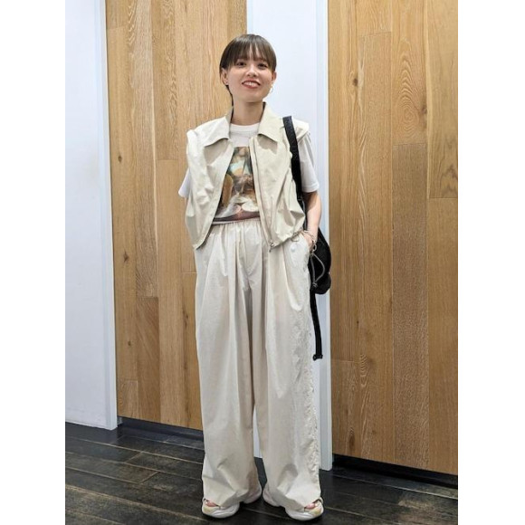 ブラウスにもジレにもなる万能アイテムが入荷しております。 程よく光沢感があり女性らしさもありつつ、モードな雰囲気にも着れる1枚。 今回はTシャツとシャカシャカしたパンツを合わせてカジュアルにしてみました。