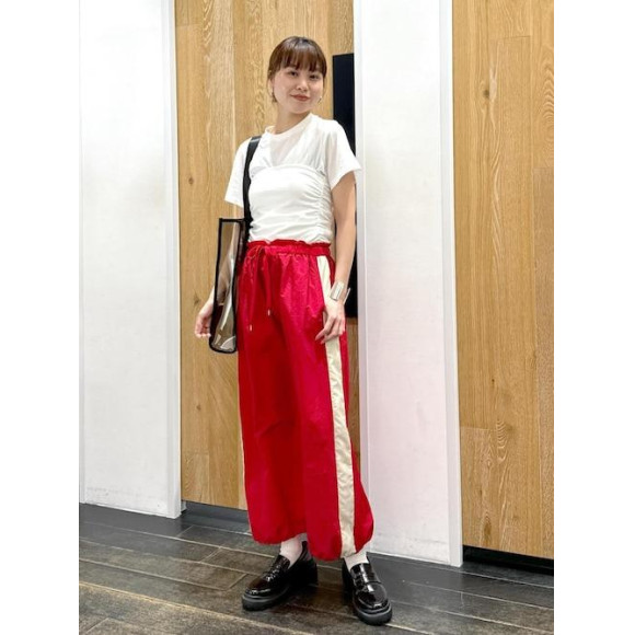 まずは気分の上がる赤!スポーティーなサイドラインとシャカシャカナイロン素材のスカートです。とにかく楽〜履き心地でお洗濯可能♩