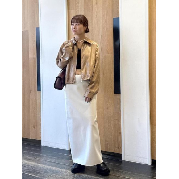 レザーライクサテンブルゾンをつかったスタイリングです!レザーライクな見た目に雰囲気があり、シャツのように薄手で軽い素材感のため気軽に羽織っていただけます。