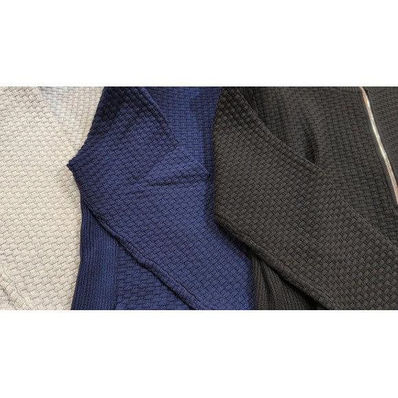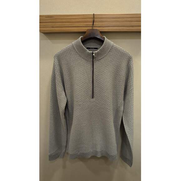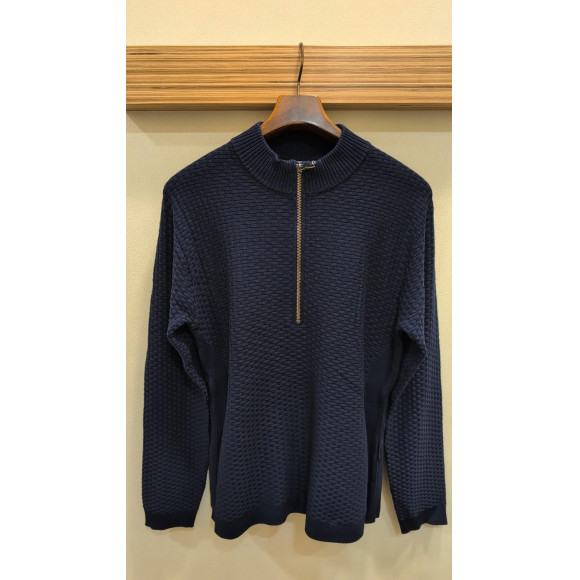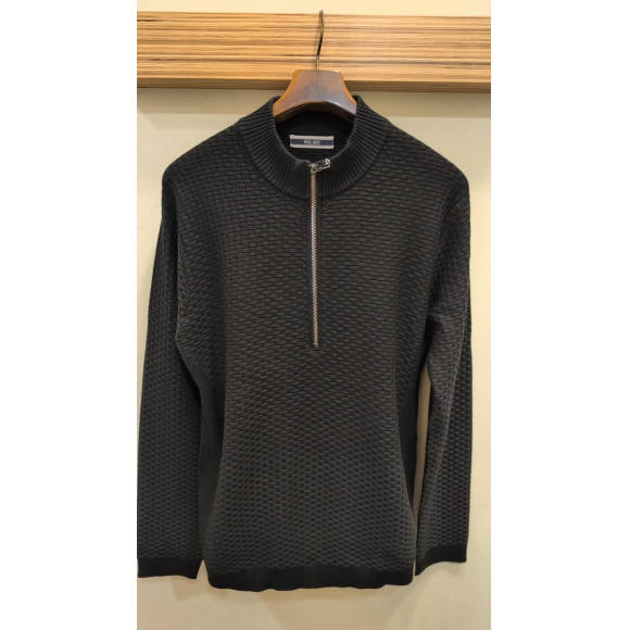 ガンメタ調の箔転写ファスナーを使用したバスケット編みのハーフジッププルオーバーニットです。