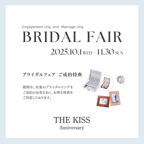 2025年10月1日(水)〜2025年11月30日(日)までの期間中、THE KISS Anniversaryのブライダルリングをご成約のお客さまに、お得な特典をご用意しております。