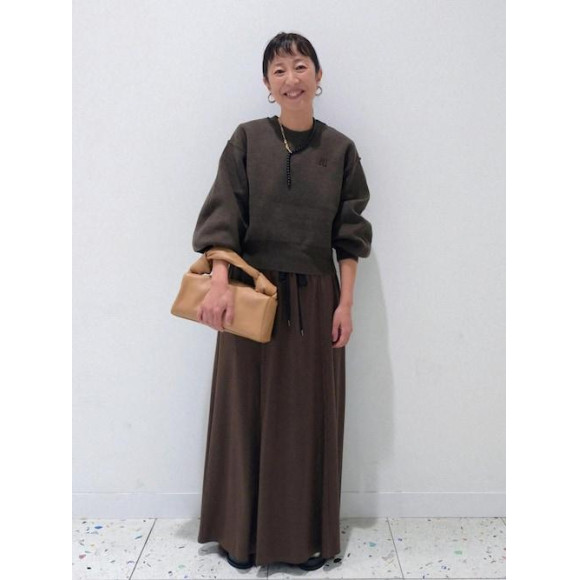 いつもご覧いただきありがとうございます。 本日は今季気分なブラウンでコーディネートしてみました。 トップスはニットとスウェットの間のような着心地の良いスウェットニット。 おうちでお洗濯もできるのでデイリーに着ていただけます。 合わせたスカートは落ち感があり揺れるシルエットがとてもきれいです。 サイドにスリットもありロングブーツと合わせても◎