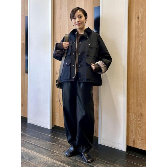 ポケットが魅力的なBarbour別注アイテム。 メンズならではの幅感、こなれて見えます☺︎ とても軽くてストレスフリー。 今の中途半端な季節から 真冬はインナーを暖かくすれば 長く着用できます。 ブラックワントーンでレザーを合わせて 異素材でお互いが良く見えるようにスタイリングしてみました。