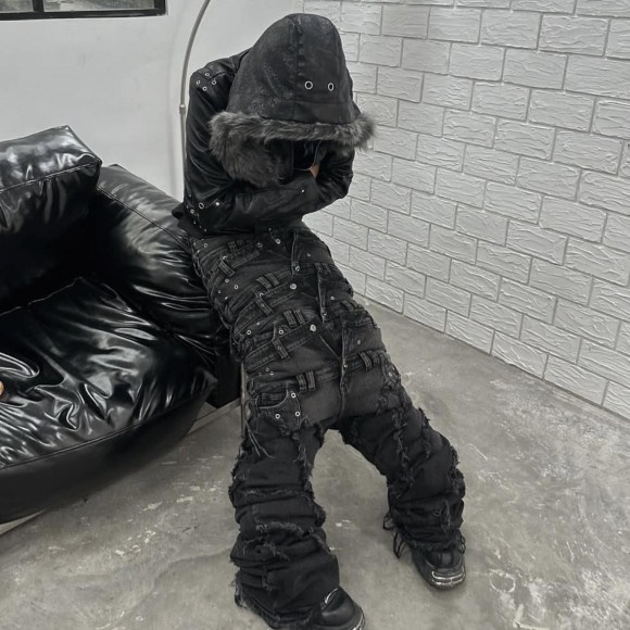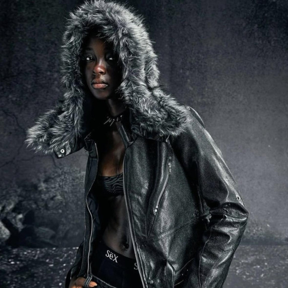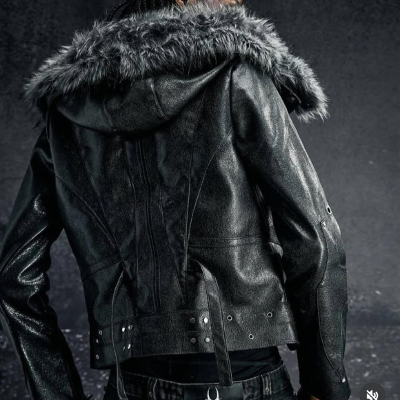 フェイクレザーにファーフードを組み合わせたジャケット。