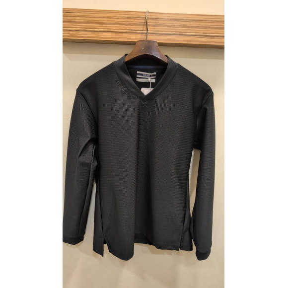 衿元のブランドロゴ刺?やブランドネームに合わせた衿ぐりのテープ始末、脇のスリット仕様をポイントに、脇の縫い代には消臭抗菌テープを入れて機能性もプラスしたこだわりの仕上がりです。