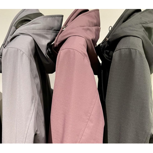 裏面にポリウレタンラミネートを施したマイクロドビー素材を採用。上品な表面感と張り感が特徴で、軽量、防風の機能性を装備したハイブリッド素材。