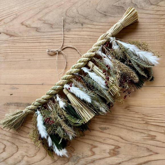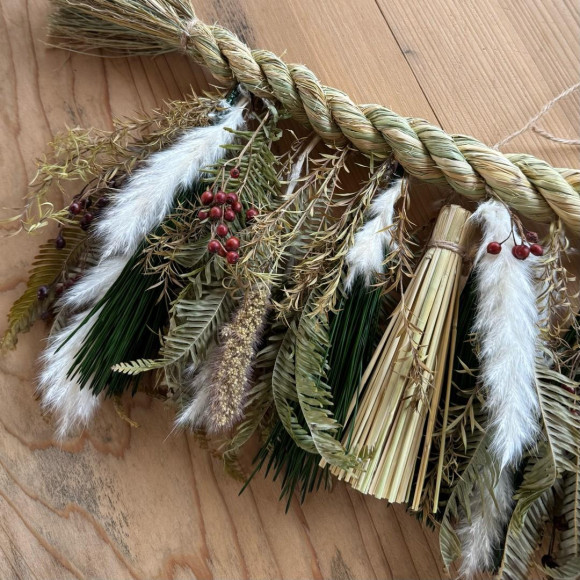 豊栄町産のもち米の藁で縄を綯(な)って「ごぼうじめ」をつくります。そして松や紅白の植物たち、藁のタッセルで彩ります。(全長約60cm)