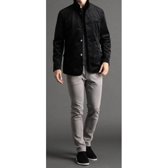 襟回りのプラスティックワイヤーで自在なスタンドカラースタイルが可能なブルゾンです。