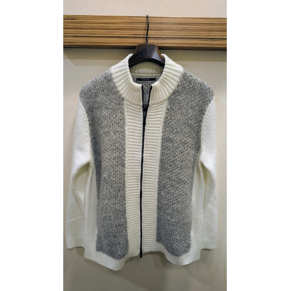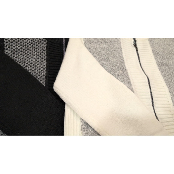 フロントの箔転写ファスナーをアクセントポイントに、ラグジュアリーかつモードな印象に仕上げました。部分的に編地を切り替え着用感を高めながらシャープなシルエットを演出。脇前の切替部分にはスラッシュポケットを設け、脇下の縫代部分にはデオドラントテープを叩きつけて機能性もプラスしています。