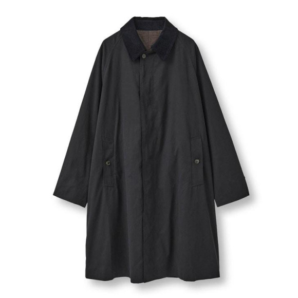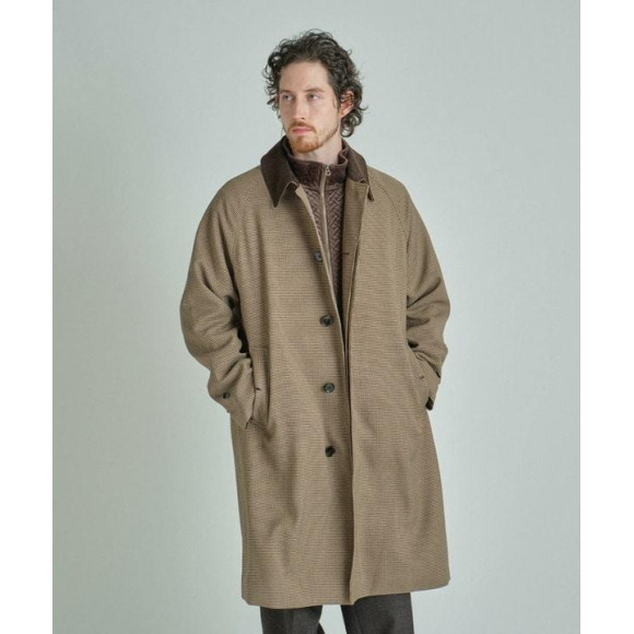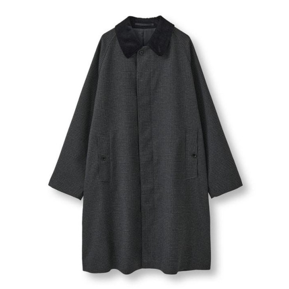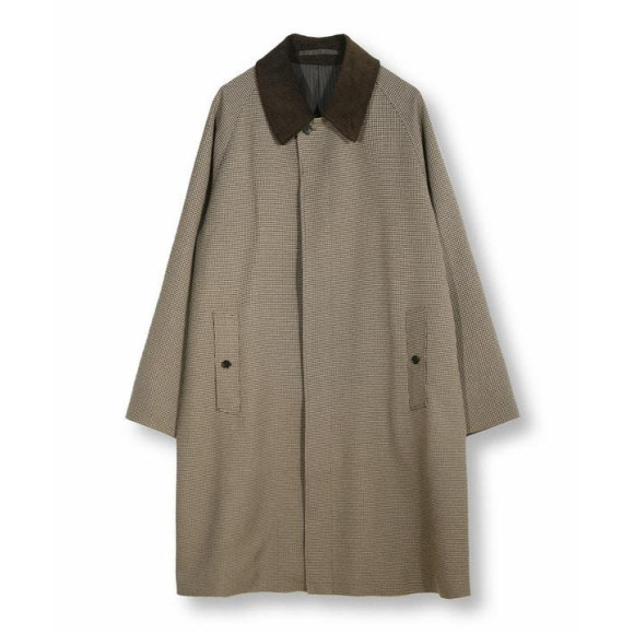 一枚袖のラグランスリーブをベースにした特別なパターンが特徴のこのコートは、ブリティッシュ・チェックやスエード調タフタ、コーデュロイ素材の組み合わせにより、上質さとカジュアルな雰囲気を兼ね備えています。