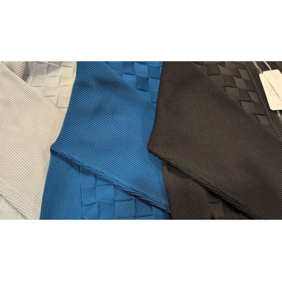 細番手を使用したハイゲージの編地が柄の凹凸感を引き立てています。箔転写ファスナーをアクセントに、ラグジュアリーかつモードな印象に仕上げています。