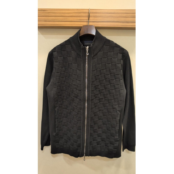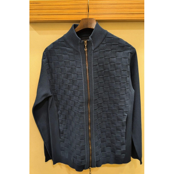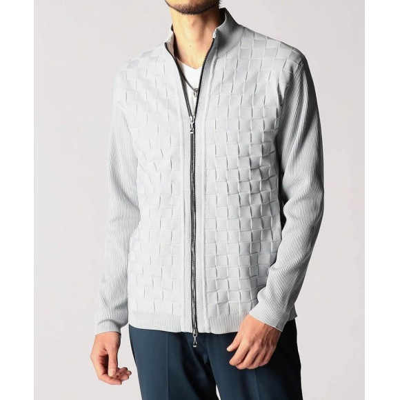 身頃をシャープなブロック柄に編み立てたフルジップタイプのスタンドニットブルゾンです。