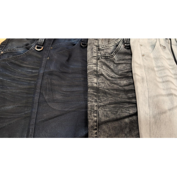 顔料を混ぜた樹脂コーティング剤を部分的吹き付け、所々アイロンでしっかり抑える事で縫い代の厚みがある部分や平たい部分に光沢を出して革パンの様な深い色味に仕上げます。