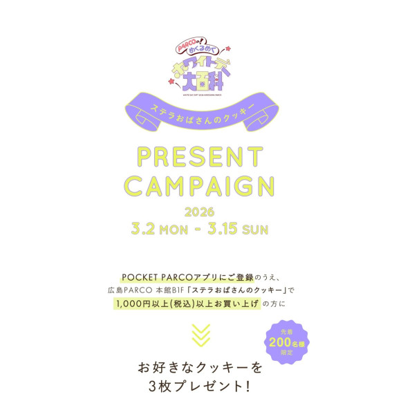 ステラおばさんのクッキー広島パルコ店限定で、POCKET PARCOのアプリ登録者様へクッキー3枚プレゼントのクーポン配信中です!