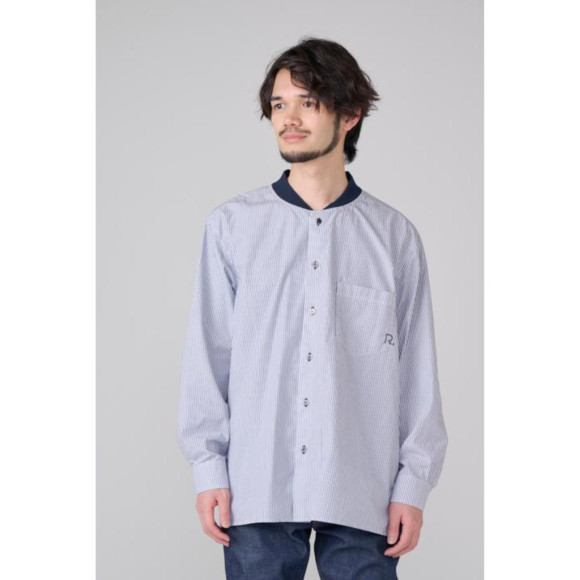 素材は綺麗目なストライプ、襟はスポーティーに仕上げることでリポらしい遊び心があり、今シーズンから新しいRロゴをかすれプリントして凝った仕上がりに。