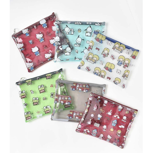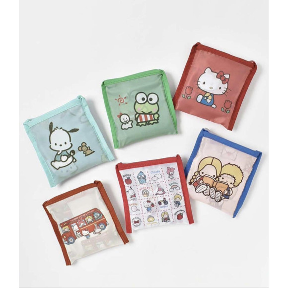 クリア素材のスクエアポーチや使いやすいサイズのエコバッグなどに、キャラクターのキュートな姿がやさしい風合いのタッチで描かれています。