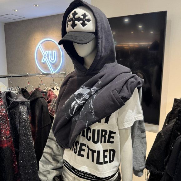 今回ピックアップしたのは『THE BOY HAS NO PATIENCE』の新作パーカーと『ESC STUDIO』のフーディー付きトップスをレイヤードした、超ハイセンスなコーディネートです☆・:*+.