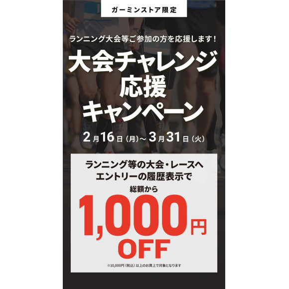 ランニング等の大会・レースへエントリーの履歴表示で総額から1000円OFF ※10000円(税込)以上のお買上で対象となります。