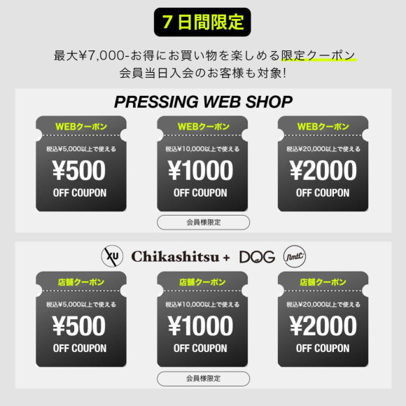 WEBと店舗合わせて1週間限定でクーポンをプレゼント。最大¥7,000-お得にお買い物をお楽しみに頂けるイベントです!当日入会のお客様も対象となります。