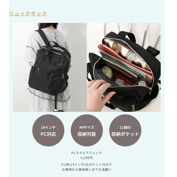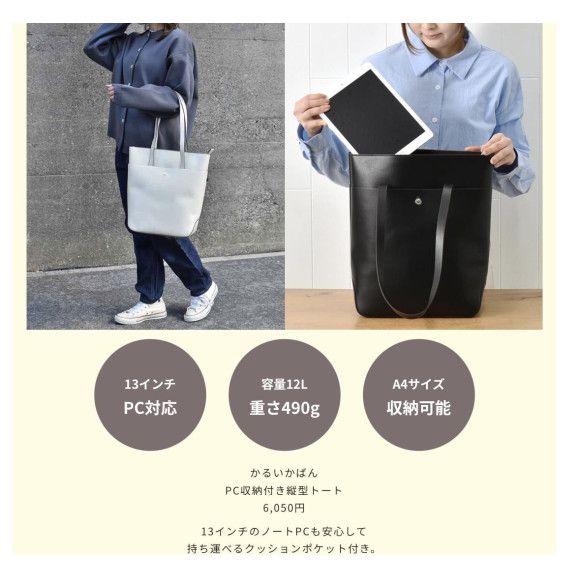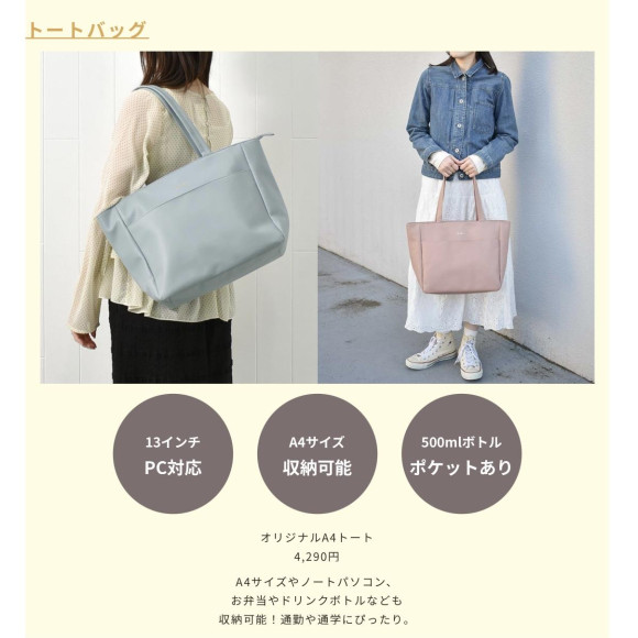 合皮のトートバッグからリュックまでいろんなバッグを揃えています。