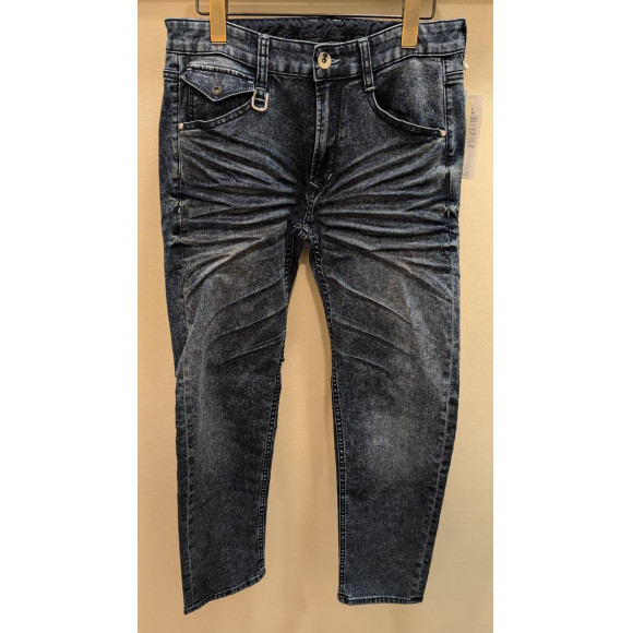 ネイビーはブラスト加工で色差をしっかり出したユーズド加工後、黒のオーバーダイ加工で全体を濃く仕上げ、3Dシワ加工+黒顔料の吹き付け加工を施してシワに陰影感をつけています。