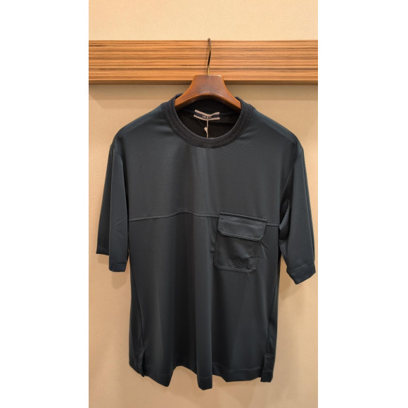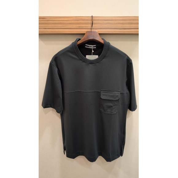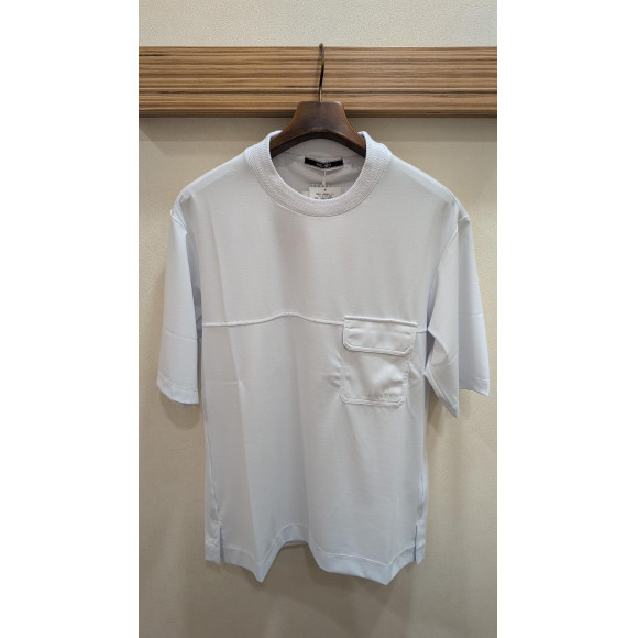 前身の切り替えとフラップ付きパッチポケットがデザインポイントのクルーネックカットソーです。