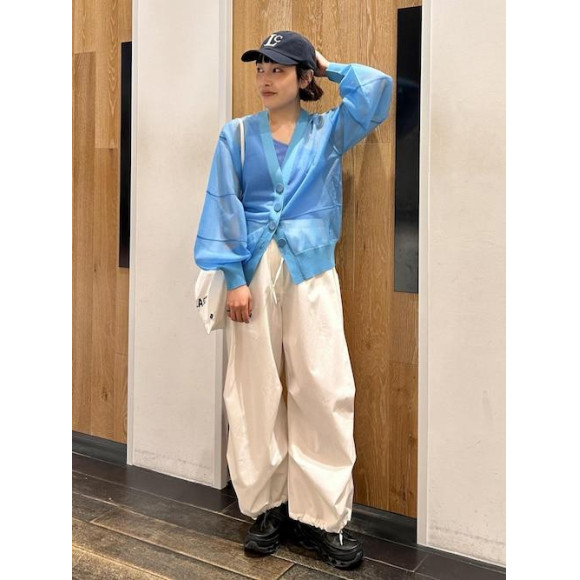 今年のトレンド〝シアー〟をメインに 爽やかなカジュアルスタイリングを組んでみました。 ブルーが目を惹くのでインナーもブルーで揃え ボトムは真っ白でカラーを引き立てました☺︎ 春夏のお出かけが楽しくなるような アクティブな雰囲気が気分です⭐︎