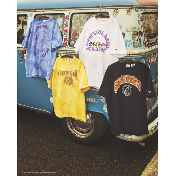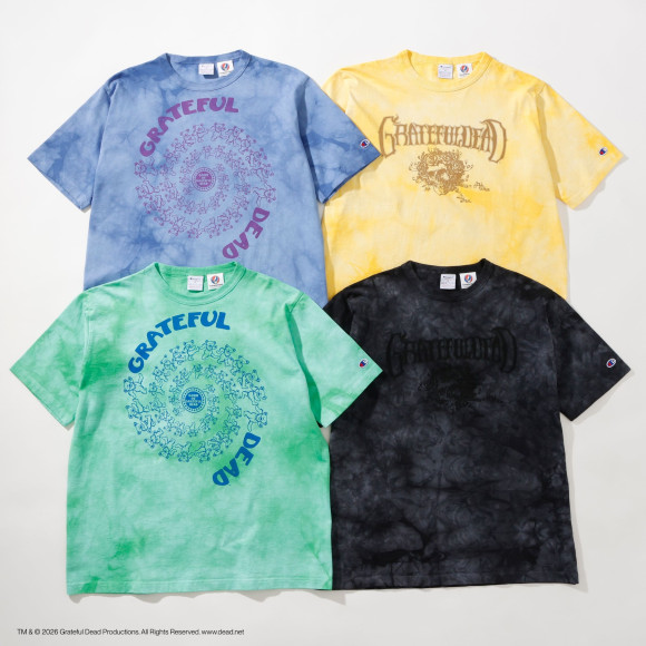 ラインナップは全2型。1型はムラ染めの手法を用いた製品染めにより、1点ごとに異なる表情を楽しめる仕上がりとなっており、ヴィンテージライクな風合いが魅力です。Grateful Deadのアートワークを象徴するダンシング・ベアをらせん状にあしらったデザインと、同じく象徴的なバラで囲まれたスカルモチーフ「Bertha(バーサ)」とGrateful Deadのロゴを組み合わせたデザインの2グラフィック展開です。もう1型は、Grateful Deadを象徴するモチーフを配したシンプルなデザインで、ダンシング・ベアにアメリカンフットボール、野球、バスケットボール、アイスホッケーの要素を組み込んだChampion らしいスポーツウエアの歴史を感じさせるデザインと、スカルヘッズとGrateful Deadのロゴを組み合わせたデザインの2グラフィック展開です。いずれのモデルも、Grateful Deadの世界観とカルチャー、そしてChampion のクラフトマンシップを掛け合わせた魅力的なコレクションとして展開します。
