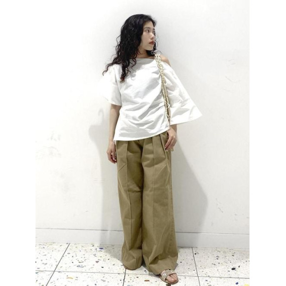 エモエレのアシメスタイルトップスのご紹介です。 右肩を落として着用するアシンメトリーなトップスです。 左脇にタックが入っており、シェイプされているので小柄なかたでもバランス良く着れます◎ 右脇にはファスナーがついておりパンツの形に合わせて開け閉めできます。 パリッとしたコットン素材は今から気温の上がる季節にぴったりの一枚です。