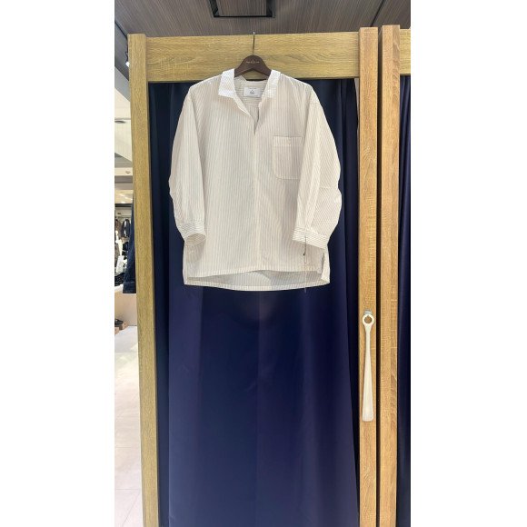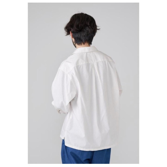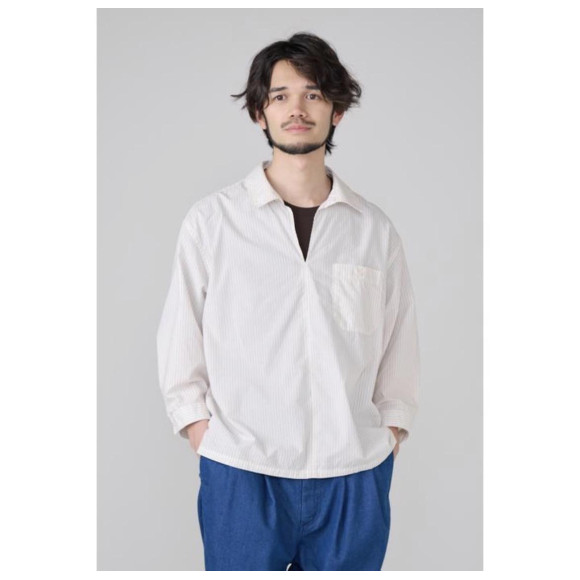 細番手のタッチの良いコットンのストライプ生地をプルオーバーで仕立て1枚でもインナーとしても使い勝手の良いシャツに仕上がっています。